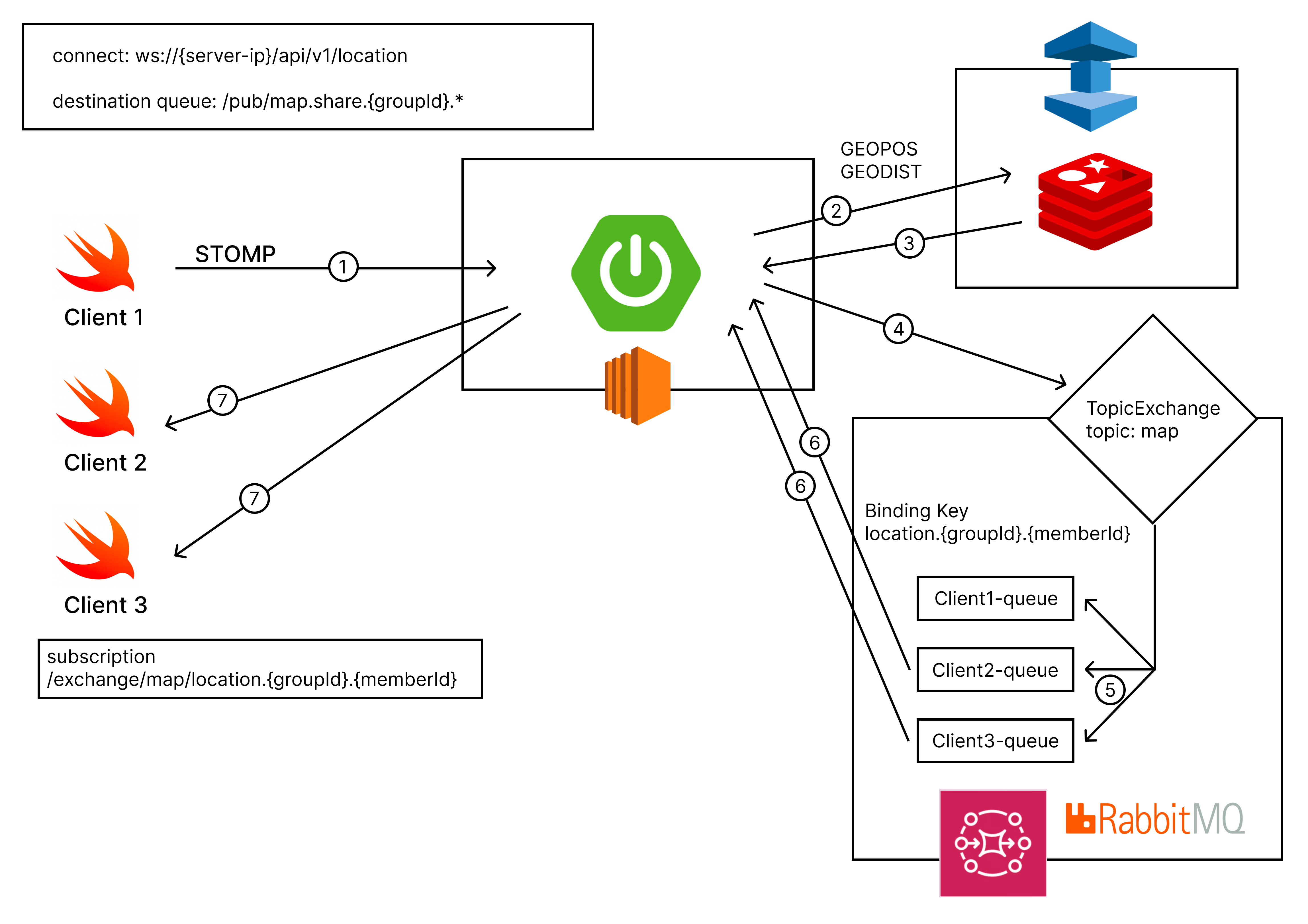 - 위치 좌표를 STOMP를 통해 보내면 자기 자신의 위치 좌표를 업데이트한다.
