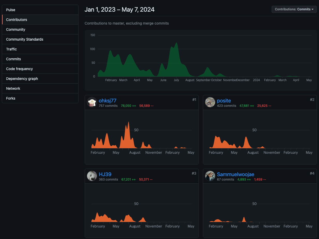 - Github Repository -> Insights -> Contributors 탭에 브라우저를 통해 들어가면 매번 분석을 위해 어느정도 Delay 이후 정보를 확인할 수 있다. 사용하고자 하는 Github API가 해당 정보들을 가져오기 때문에 느린 것으로 예상된다.
