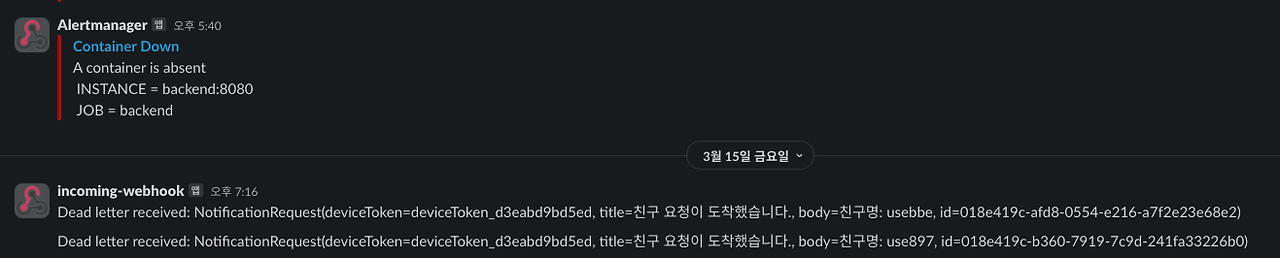 - 장애 상황을 빠르게 파악하고자 AlertManager로 슬랙 알림 발송하도록 구성했다.